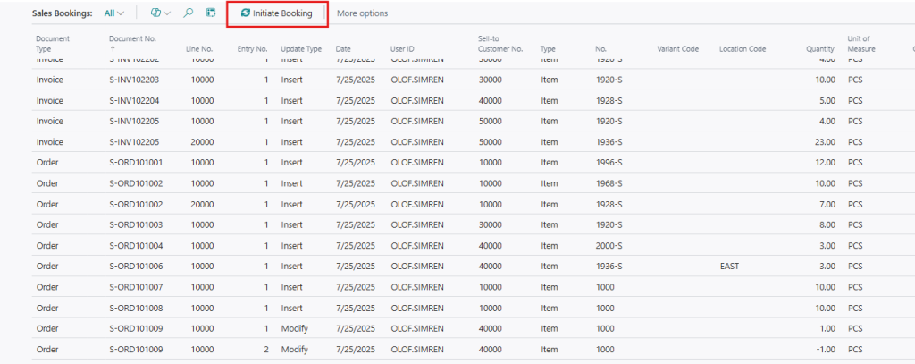 If you have existing sales or purchase documents when the app is installed you need to initiate the booking entries tables. There are two tables, Sales Bookings and Purchase Bookings, navigate to those tables and select Initiate Booking. This needs to be done in each company in the environment.