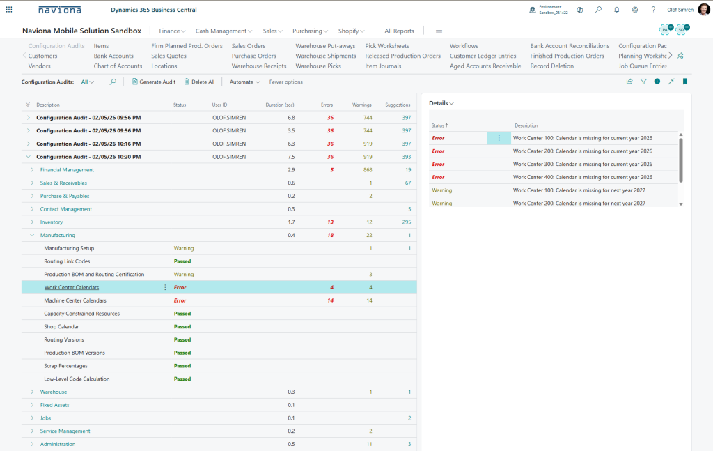 The Naviona Configuration Audit extension for Microsoft Dynamics 365 Business Central is a comprehensive configuration validation tool designed to help organizations ensure their Business Central environment is properly configured, optimized, and ready for production use. By performing automated checks across all major application areas, this extension identifies configuration gaps, potential issues, and opportunities for improvement before they impact business operations.