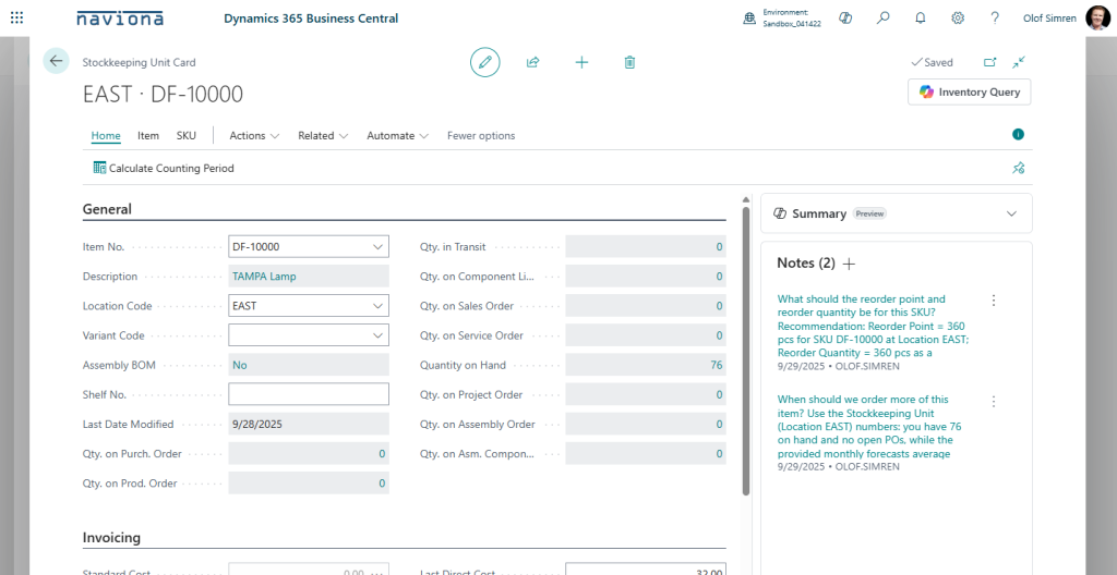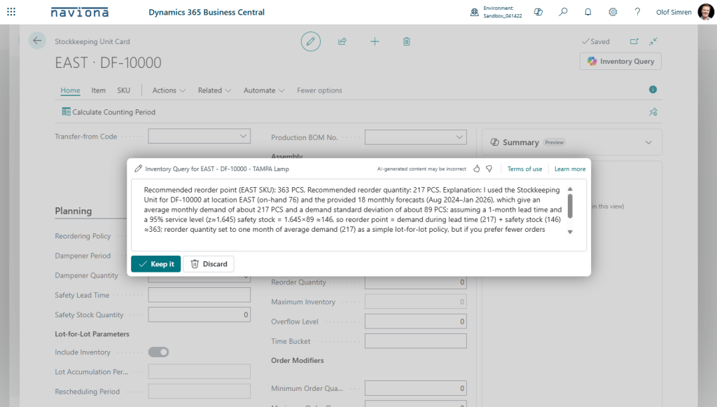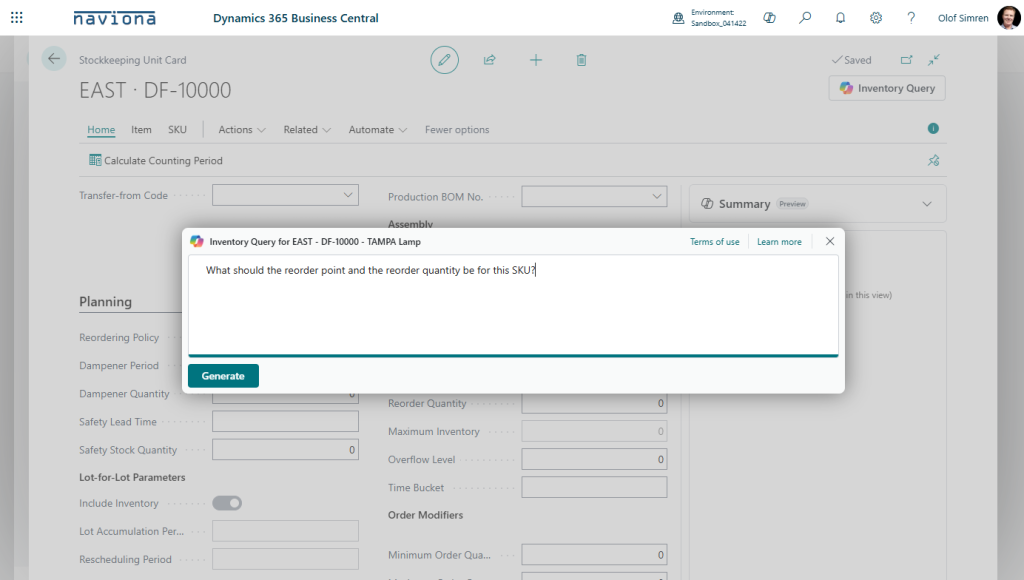 To use the Copilot for Inventory Queries you simply select the Inventory Query option from either the Items or SKUs (the option is available from both the list and card pages). Then you enter the query, like ‘What should the reorder point and reorder quantity be for this SKU?’, and select Generate.