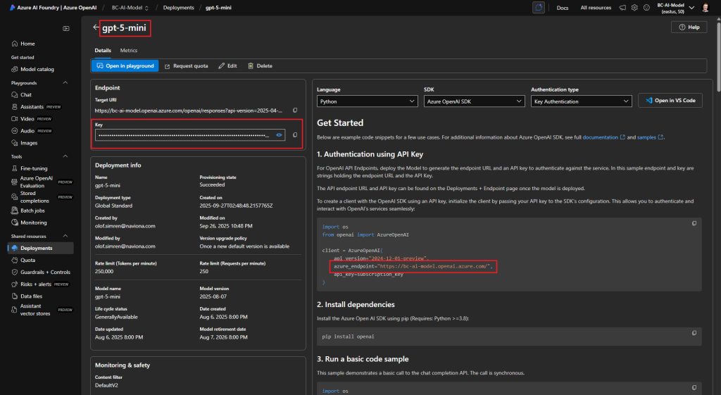 The Endpoint, Deployment and API Key are values that you find in your Azure OpenAI model according to below.