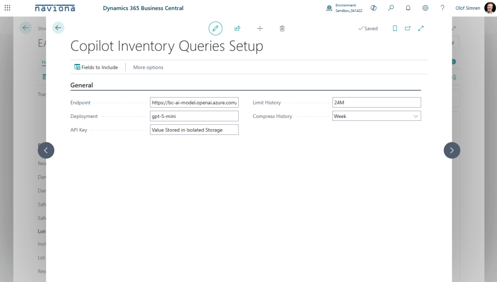 The Copilot Inventory Queries Setup is where you add the connection details to you Azure OpenAI model and control what data is being sent from Business Central to the AI model as part of the prompt.
