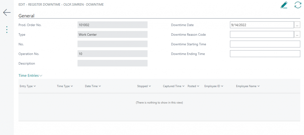 After entering the Ending Time the system will ask to register the downtime. Register downtime created Time Entries of the type Downtime. This can then later be reported on and it can be used to deduct the Setup and Run Times posted against the operation.