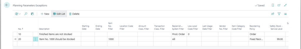 Exception No. 10 makes sure that all items that are setup to be produced with a low-level code as 0 will have a Reordering Policy Order (low-level code 0 means items that doesn’t exists as components on any production bill of materials). Exception No. 20 makes sure that item no. 1000 will have a Reordering Policy as Fixed Reorder Qty. and a Safety Stock Service Level as 99.
