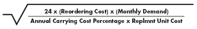 Where the Replenishment Unit Cost is taken from the Last Direct Cost on the Item/SKU Card, the Monthly Demand is the Average Monthly Usage and the Annual Carrying Cost Percentage and the Reordering Cost is according to the setup below described bellow.