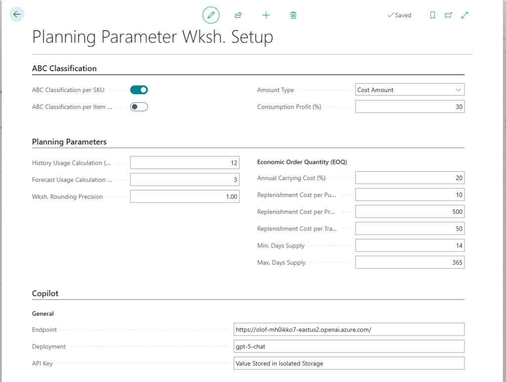 The Copilot tab contains the setup to link Business Central to your Azure OpenAI model. This configuration is necessary if you want to use Copilot to suggest planning parameters.