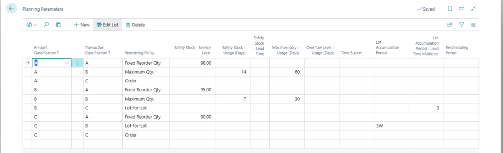 The Planning Parameters table specifies how the system will calculate the Planning Parameters for each combination of ABC Classification.