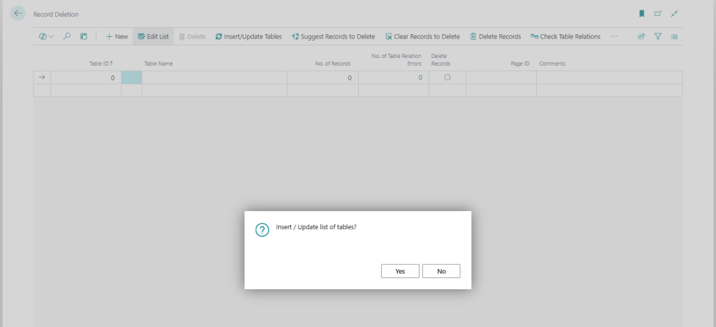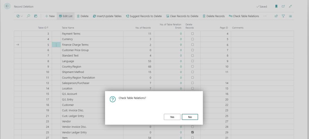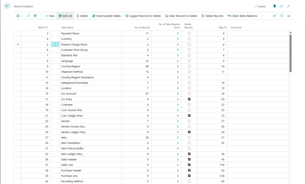 Then you go through and select the tables you want to delete records from by checking the Delete Records field. The function called Suggest Records to Delete will select the tables you typically want to delete records from when cleaning a company from transactional data. Note that the selection of tables in this function is based on a World Wide version of Business Central. If you have a localized version, any add-ons or customizations then you will need to review those tables and manually select additional tables to delete records from. Also note that we are not responsible if this suggestion selects something you don’t want to delete or skips something that you do want to delete. 🙂