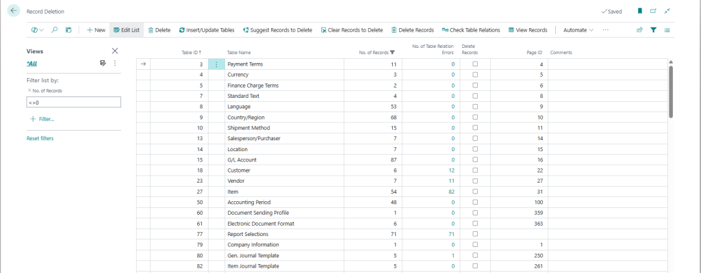 After the records have been deleted it is recommended to review the tables that still have data in them to make sure you have not missed anything. The easiest way to do this is to just apply a filter on the No. of Records field to be <>0 and use the View Records function to view the records in the tables.