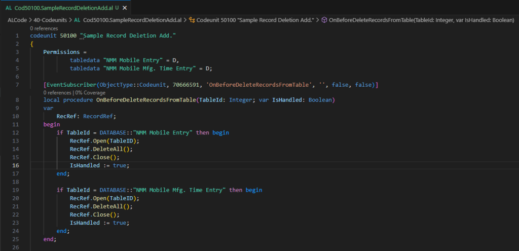Codeunit 70666591: OnBeforeDeleteRecordsFromTable(TableId: Integer; var IsHandled: Boolean)